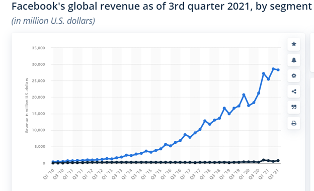Facebook ogłosił nową strukturę segmentu sprawozdawczości finansowej zaczynając od IV kwartału, z dwoma sektorami: Rodzina aplikacji (FOA), która obejmuje Facebook, Instagram, Messenger, Whatsapp oraz inne usługi oraz Facebook Reality Labs (FRL), który obejmuje rozszerzone I wirtualna rzeczywistość sprzętu konsumenckiego, oprogramowanie i treść.